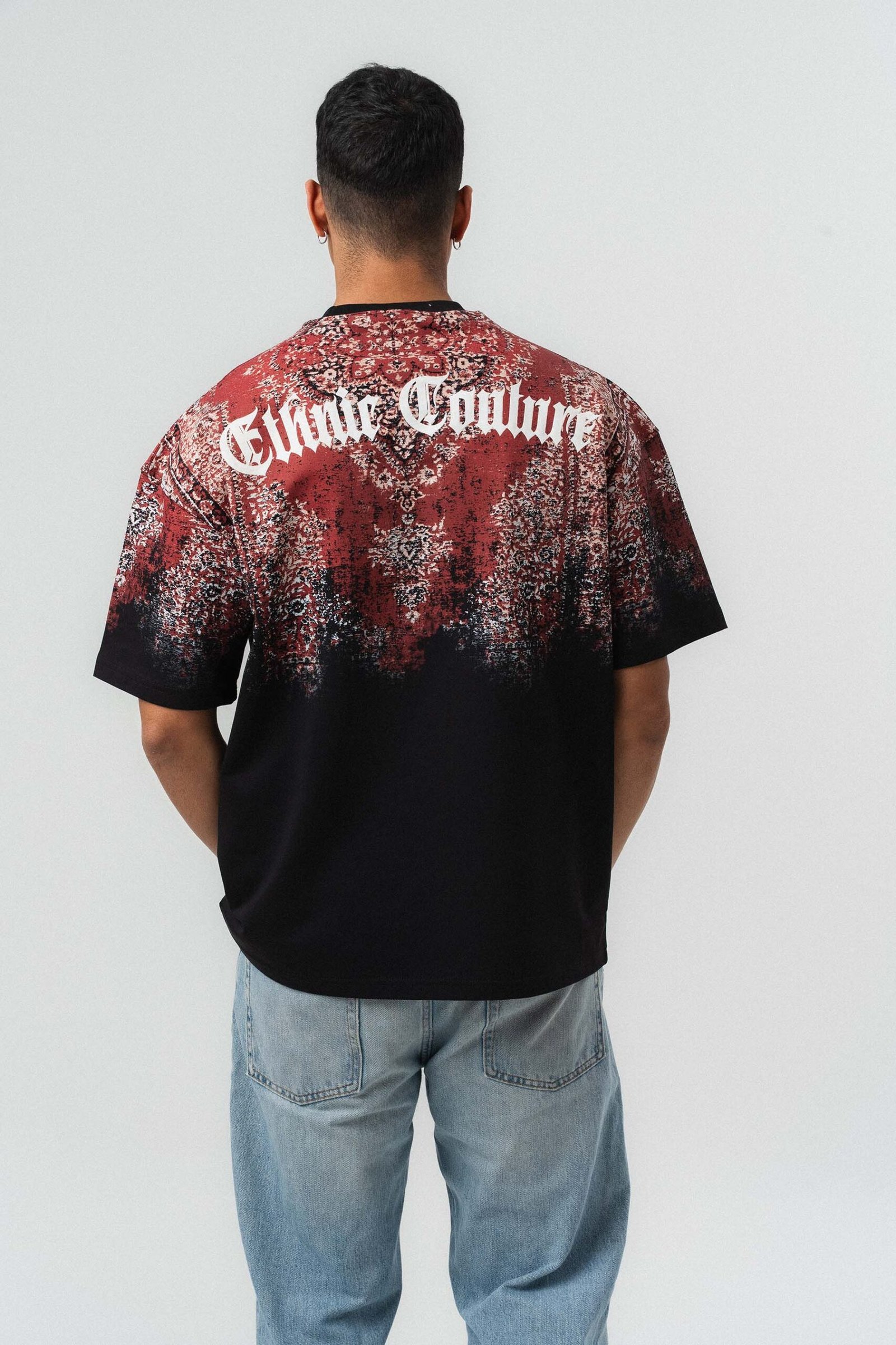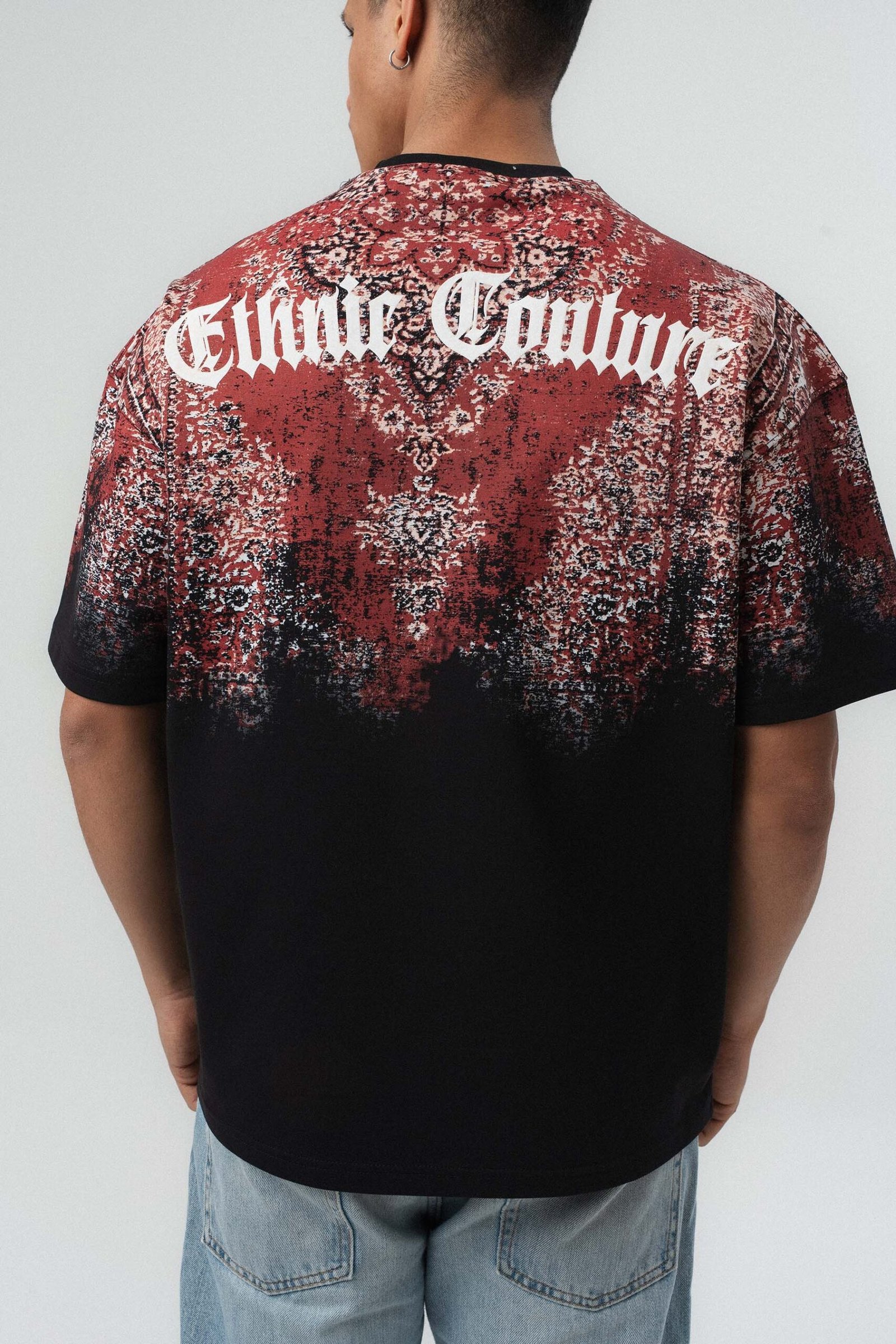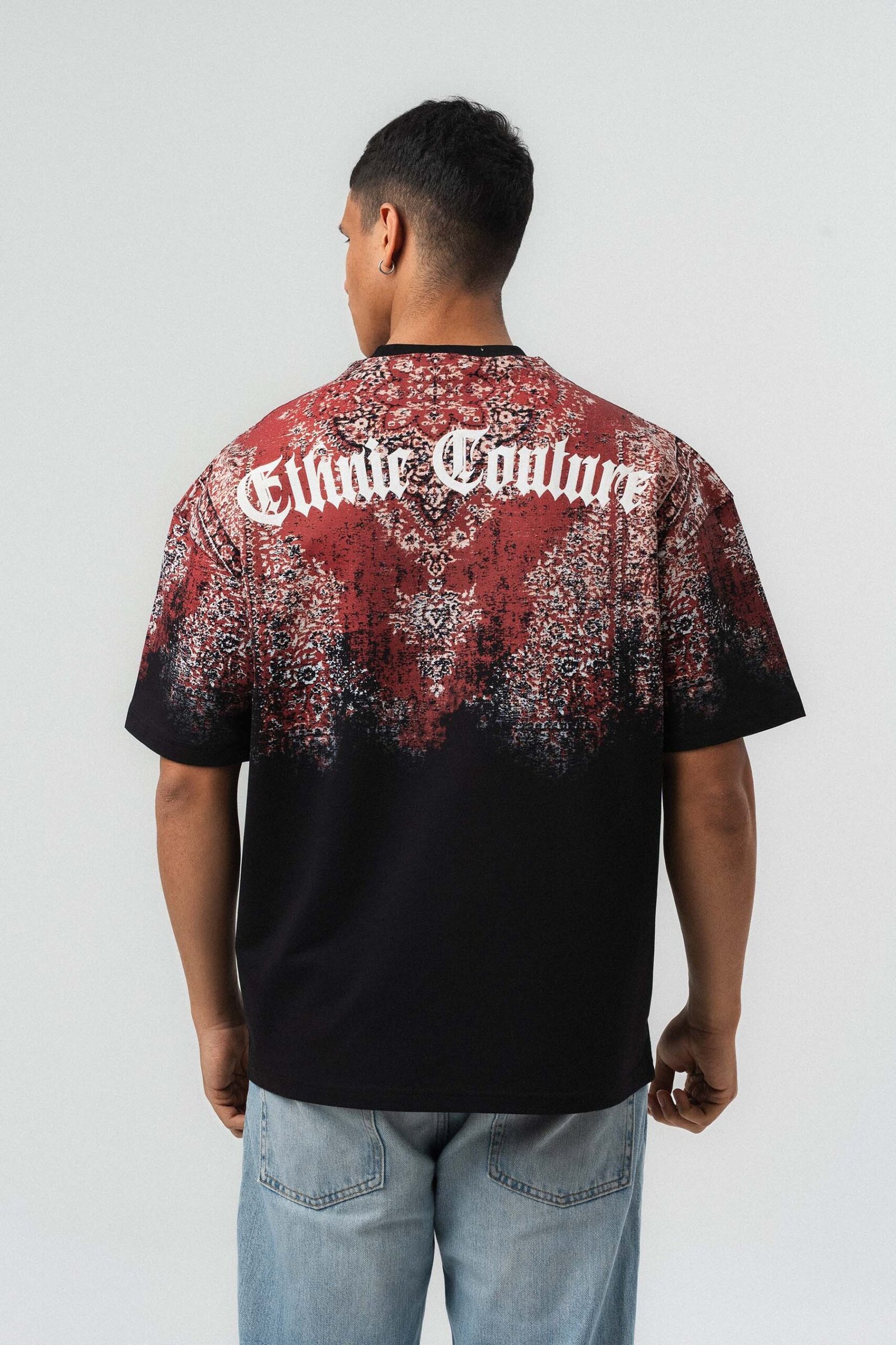 Etnik Desen Embroidered Embossed Black Oversize Printed T-Shirt