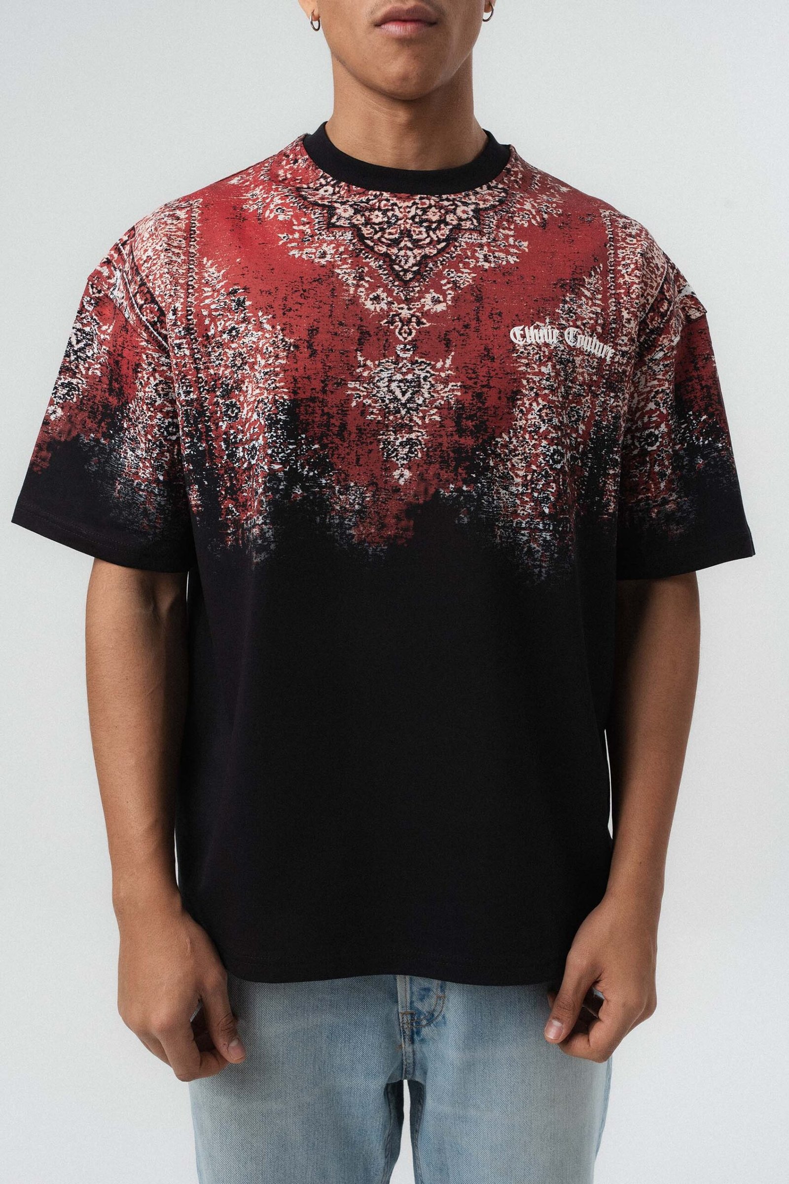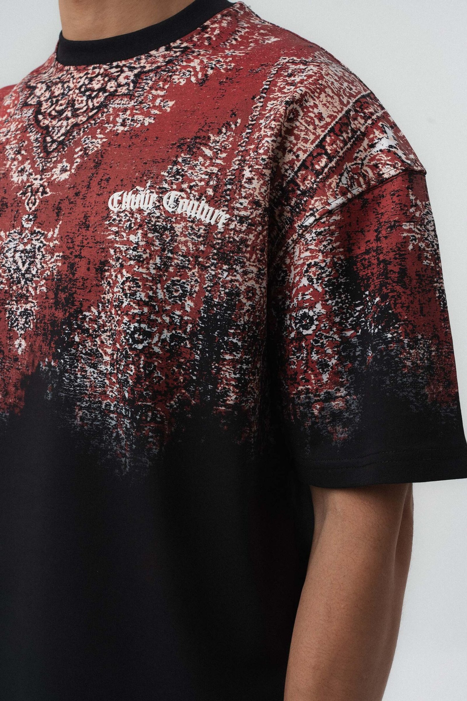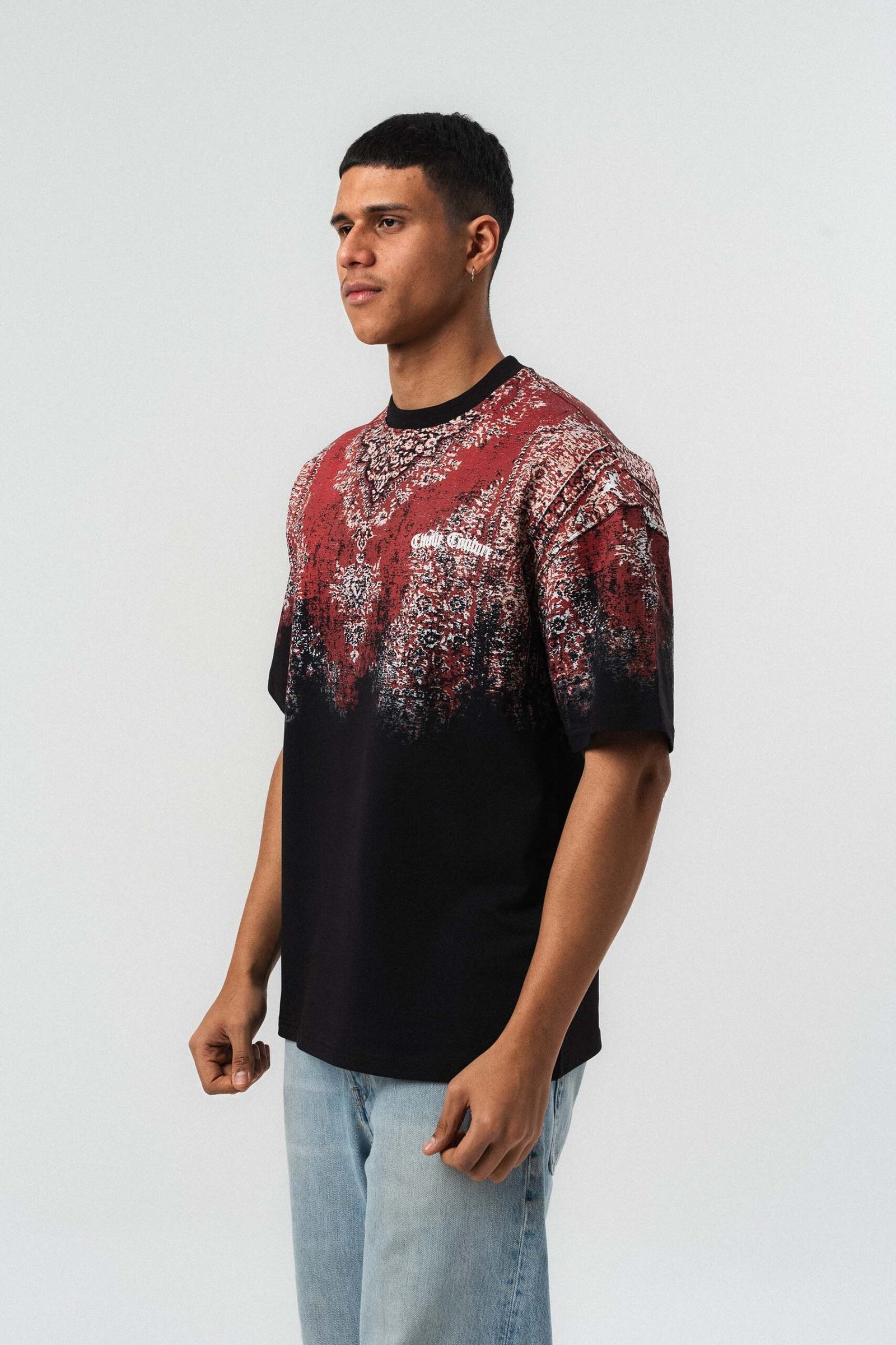 Etnik Desen Embroidered Embossed Black Oversize Printed T-Shirt