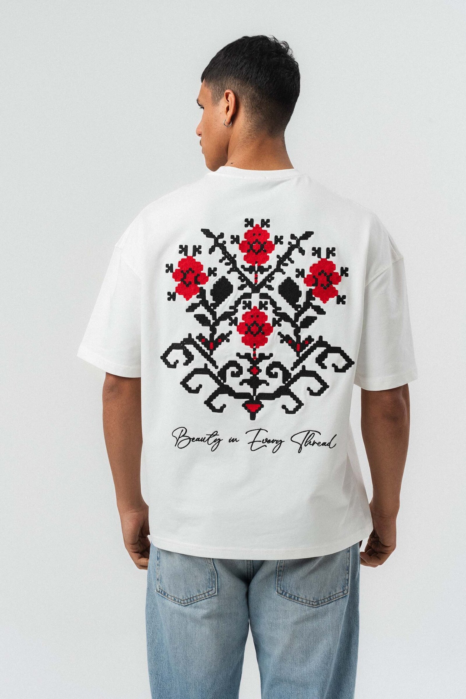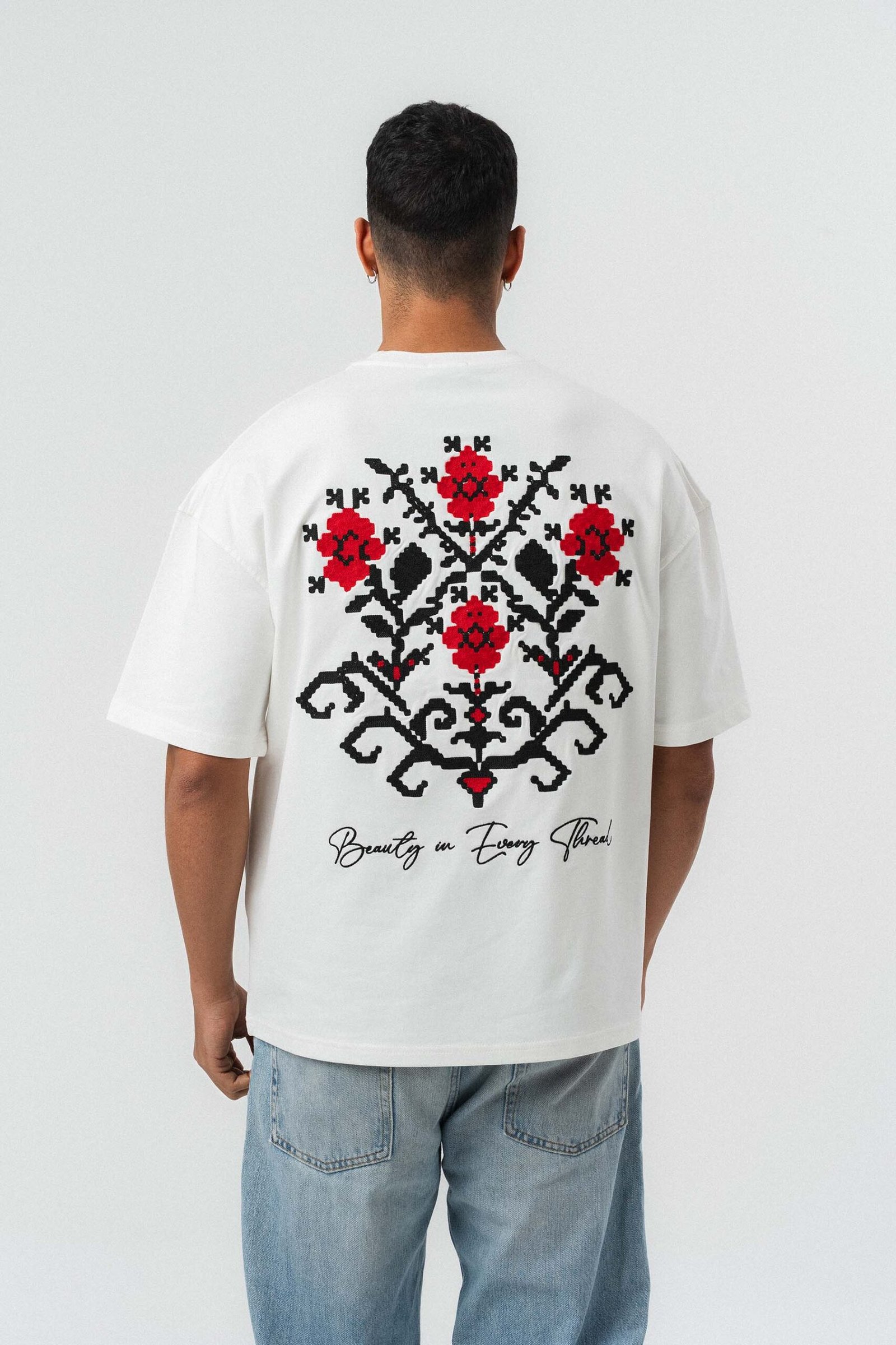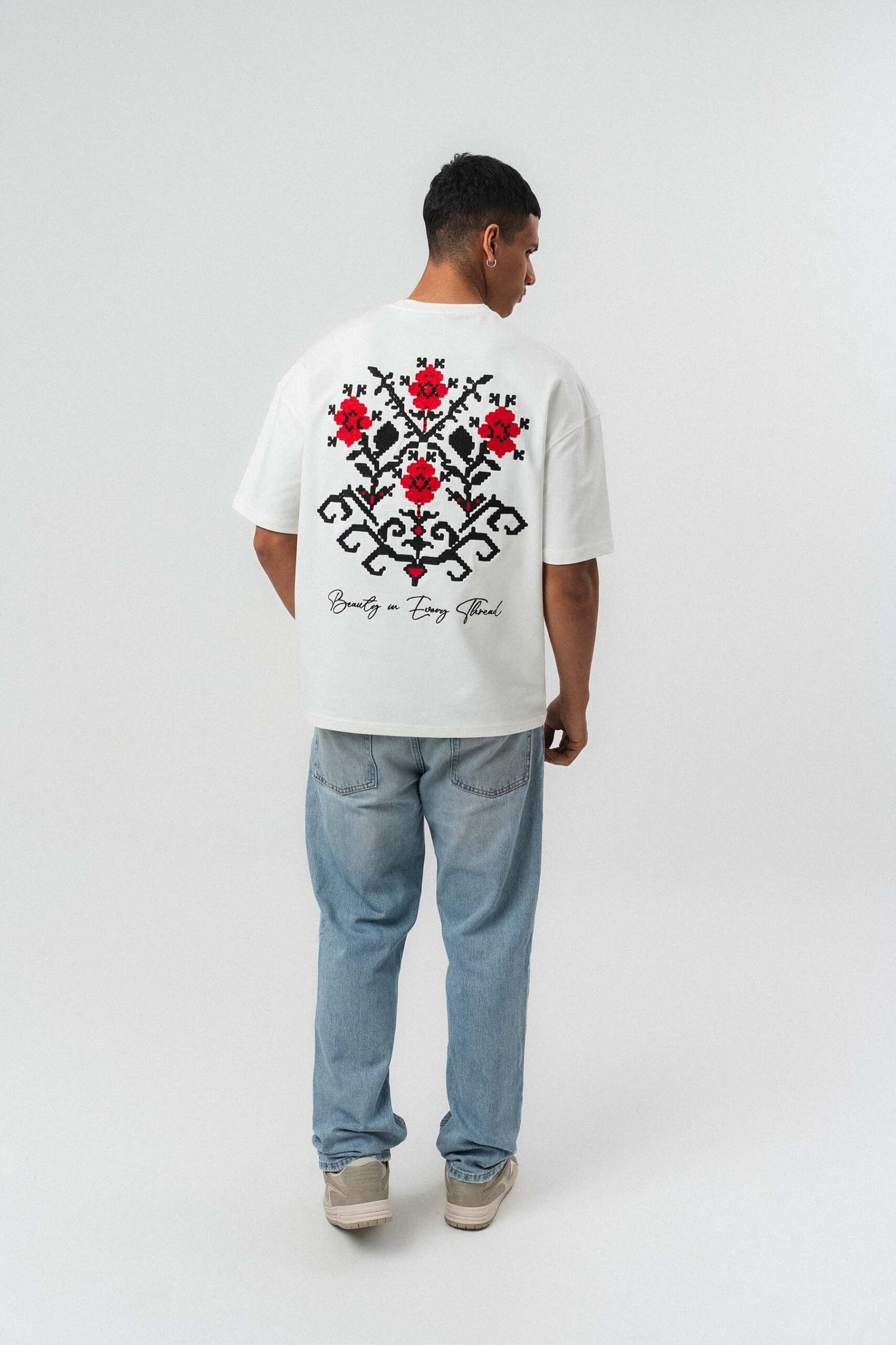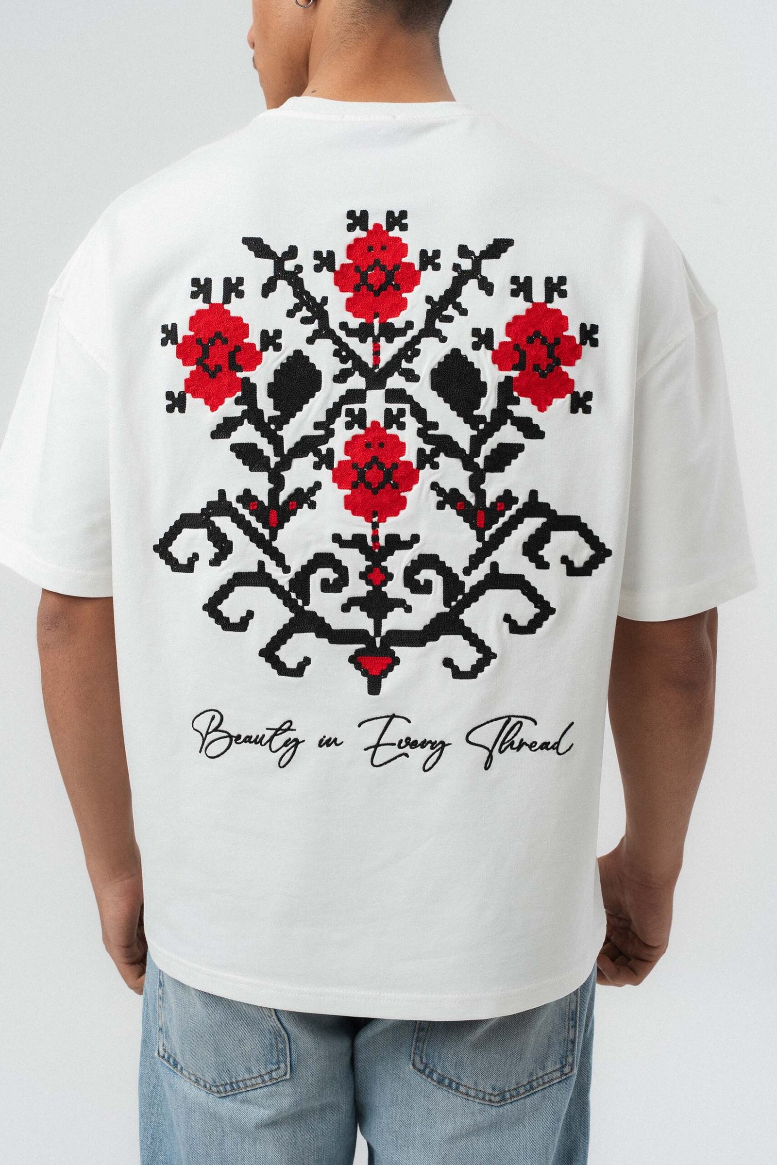 Etnik Patterned Embroidered White Oversize Printed T-Shirt