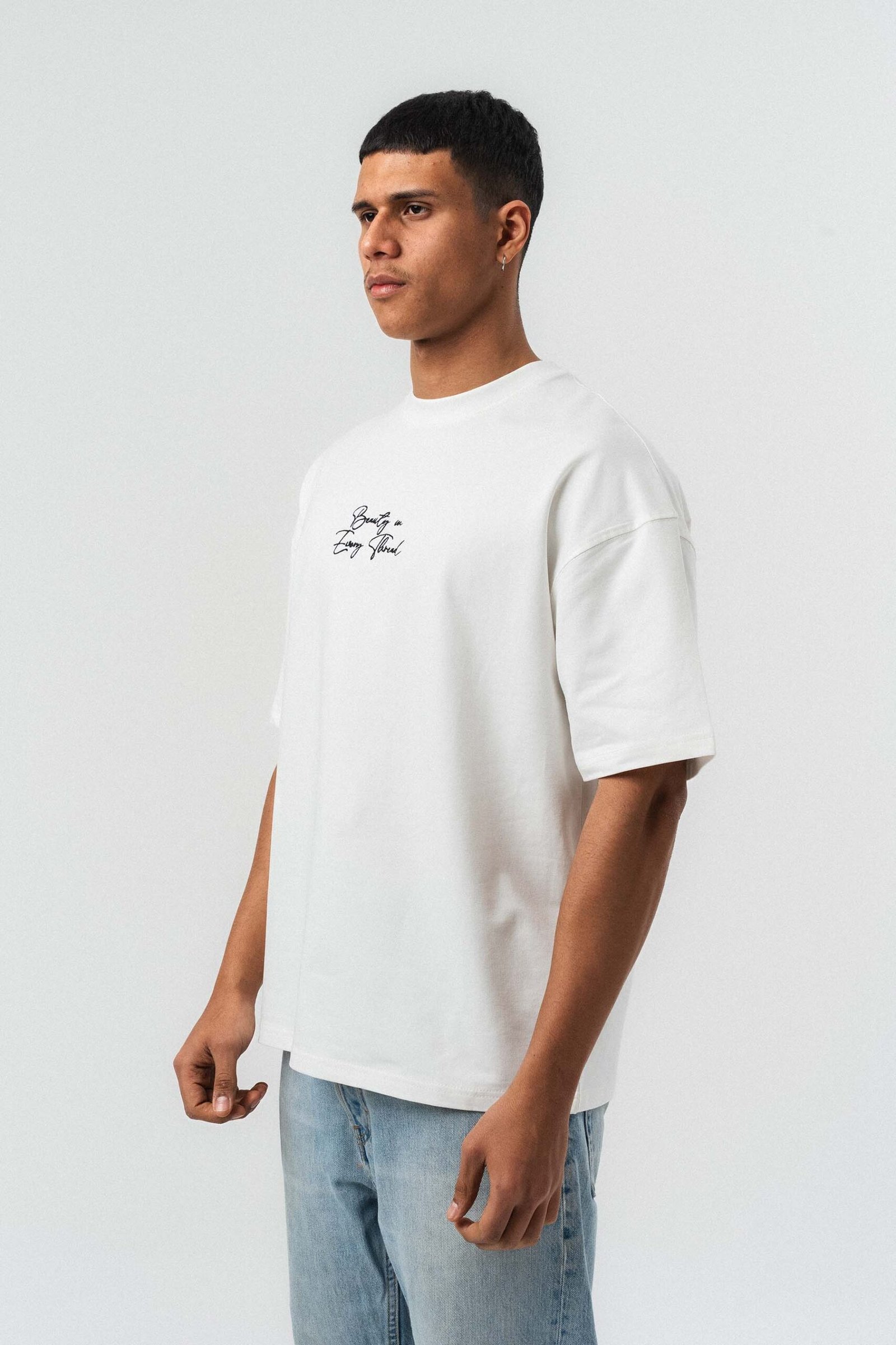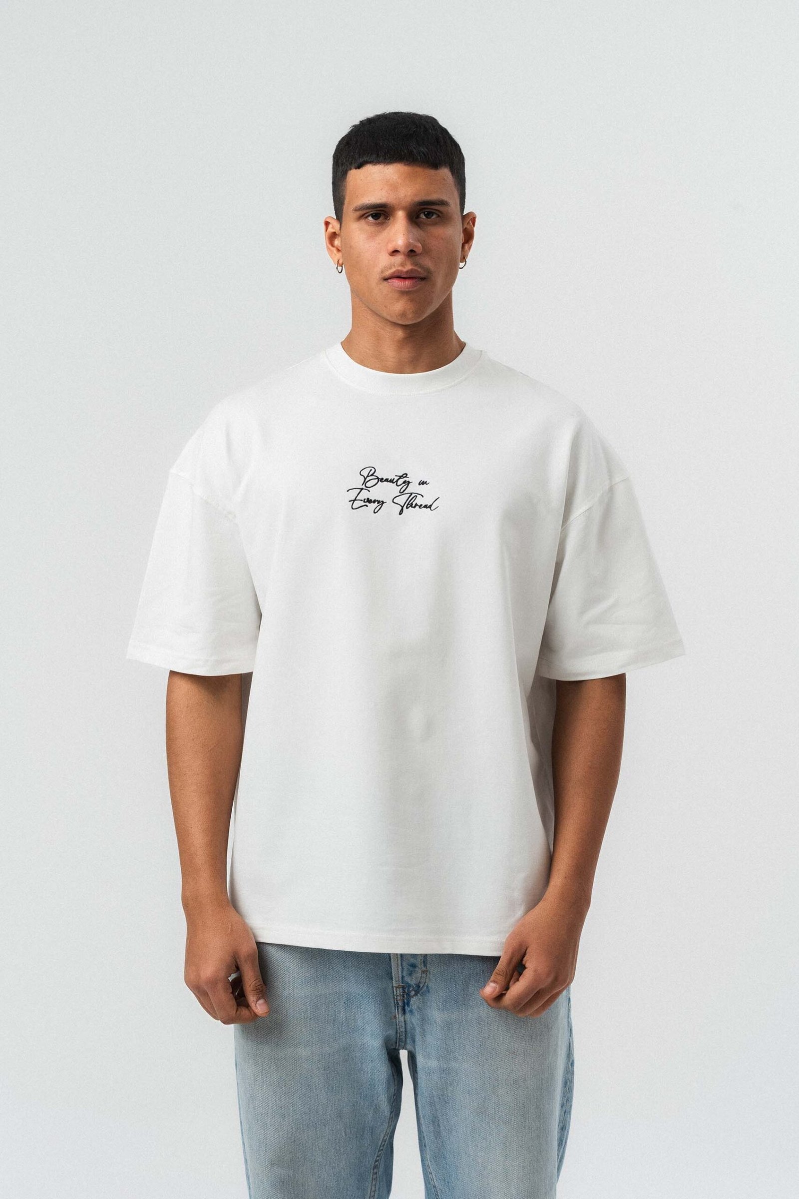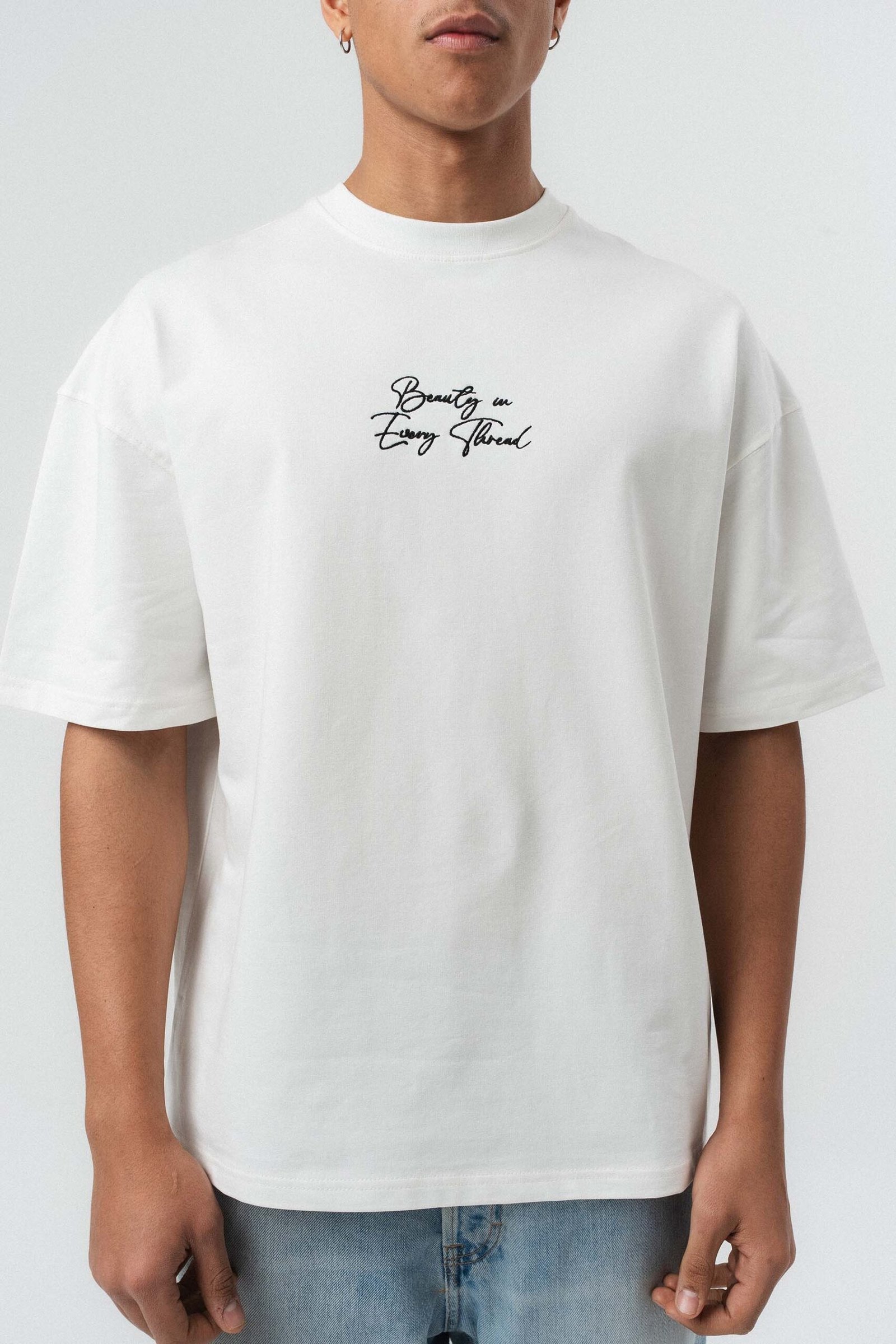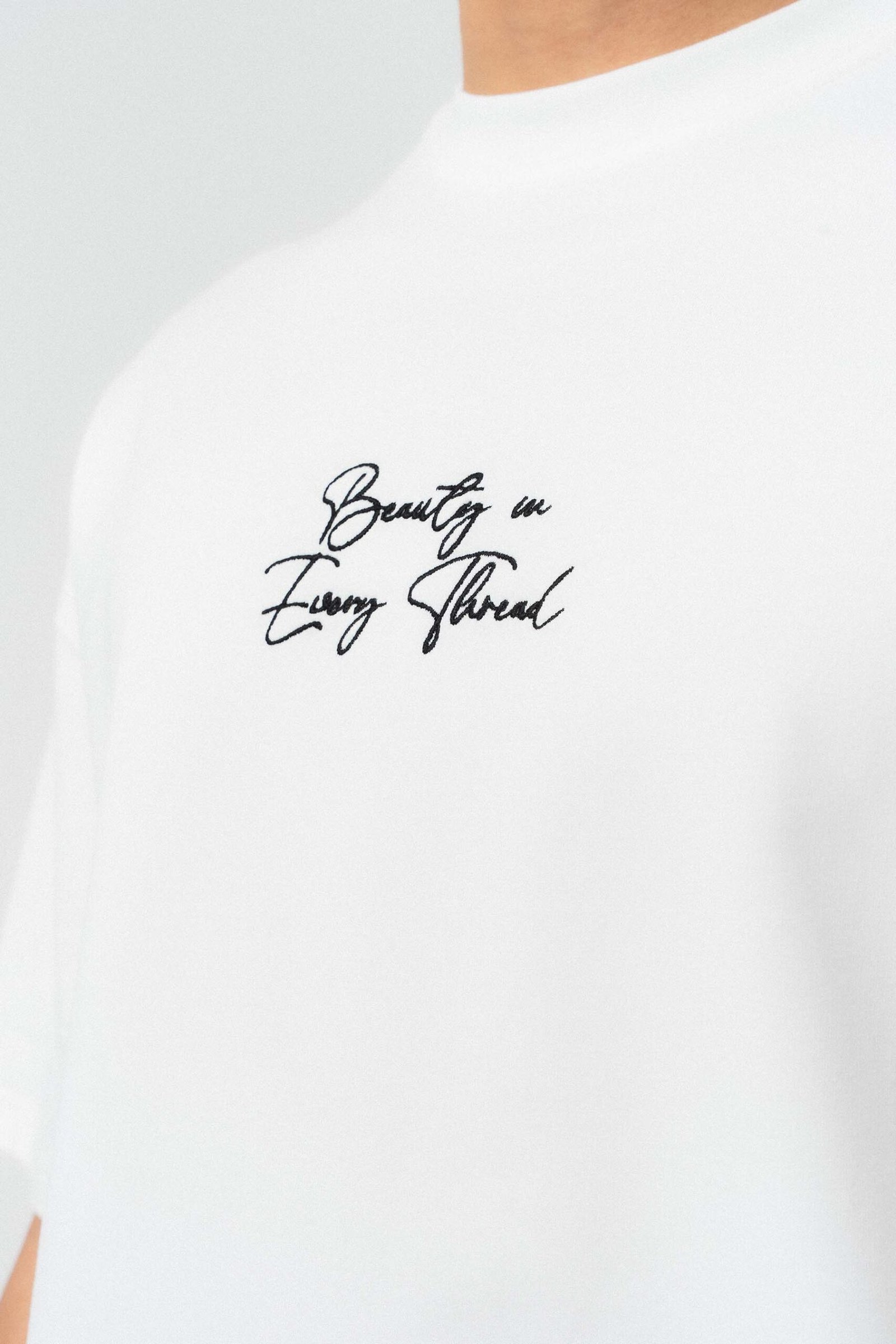 Etnik Patterned Embroidered White Oversize Printed T-Shirt