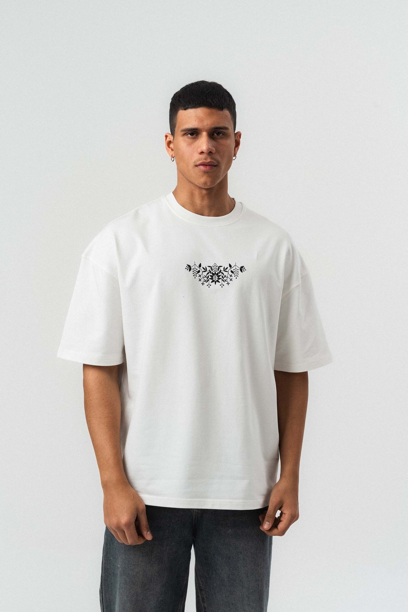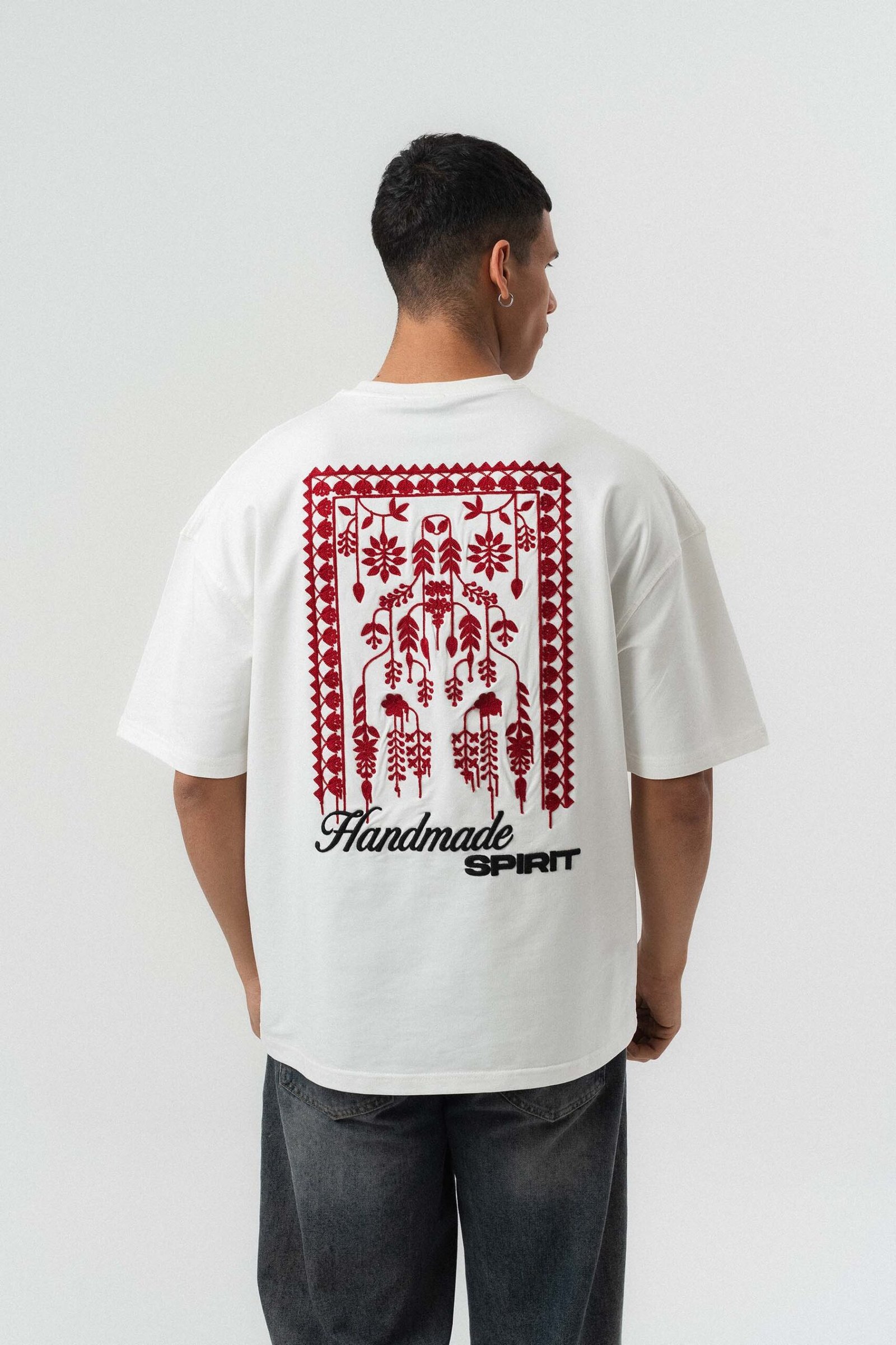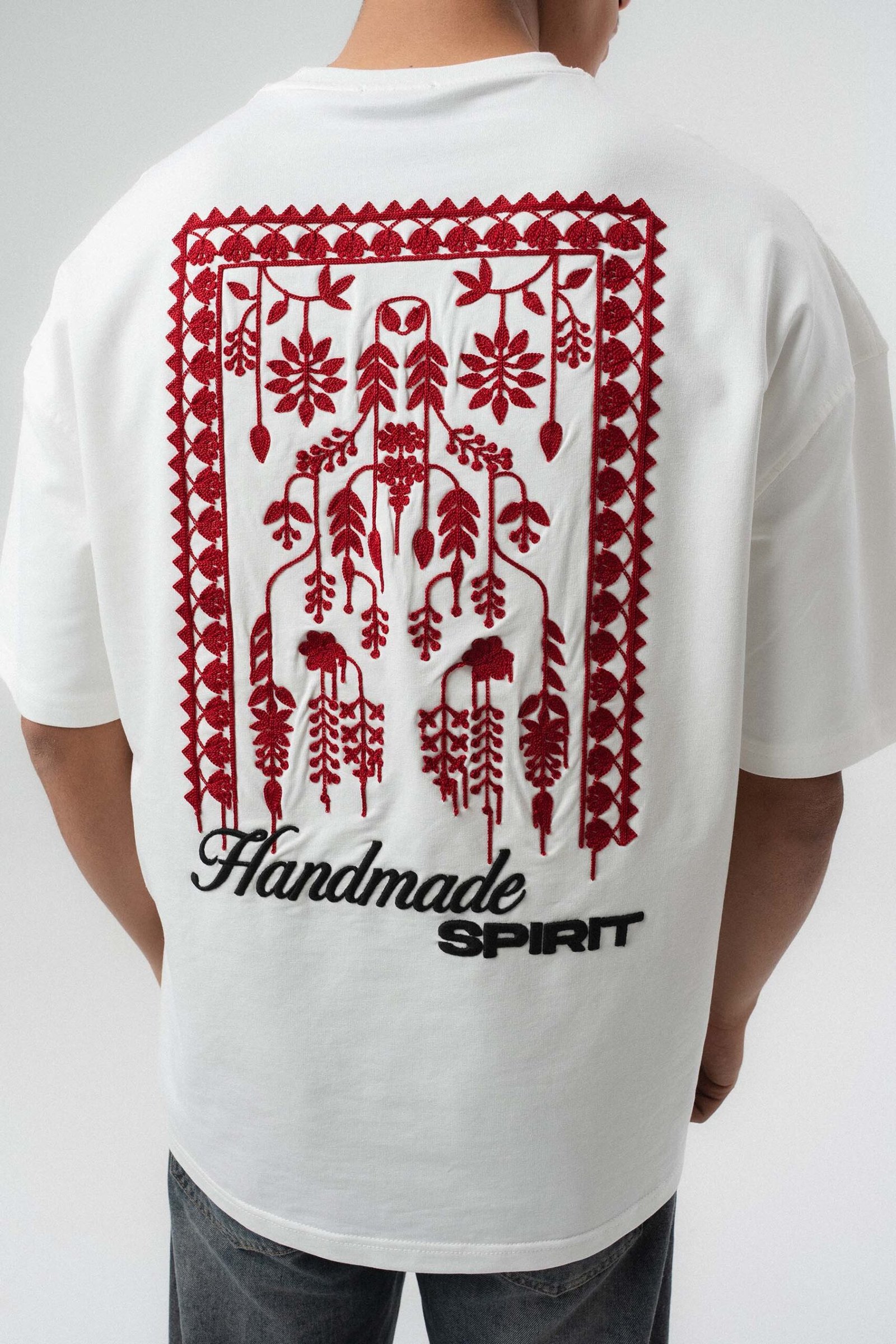 Handmade Sprit Etnik Patterned Embroidered White Oversize Printed T-Shirt
