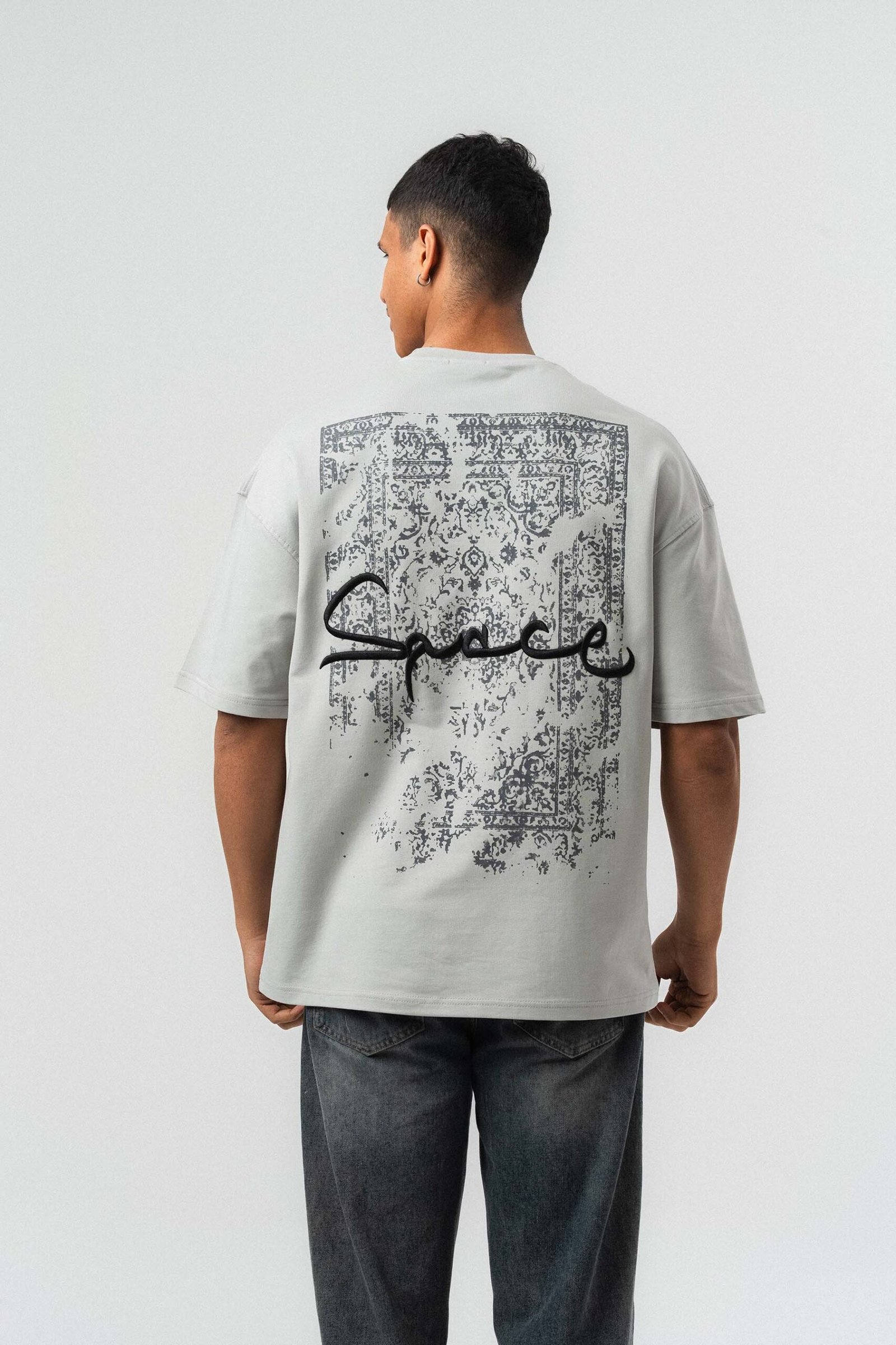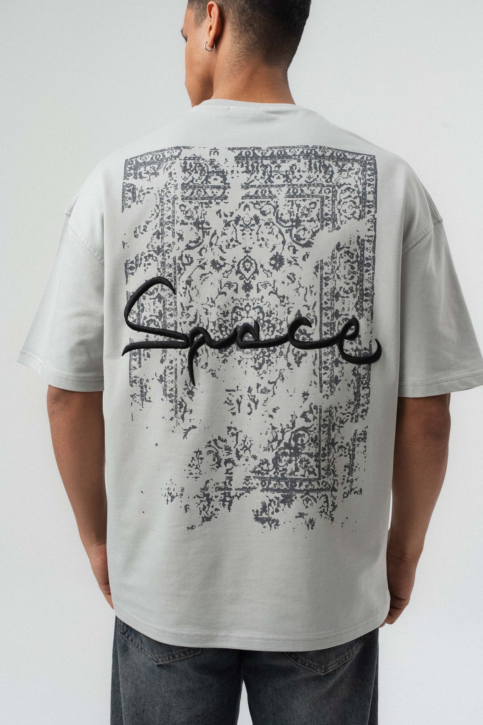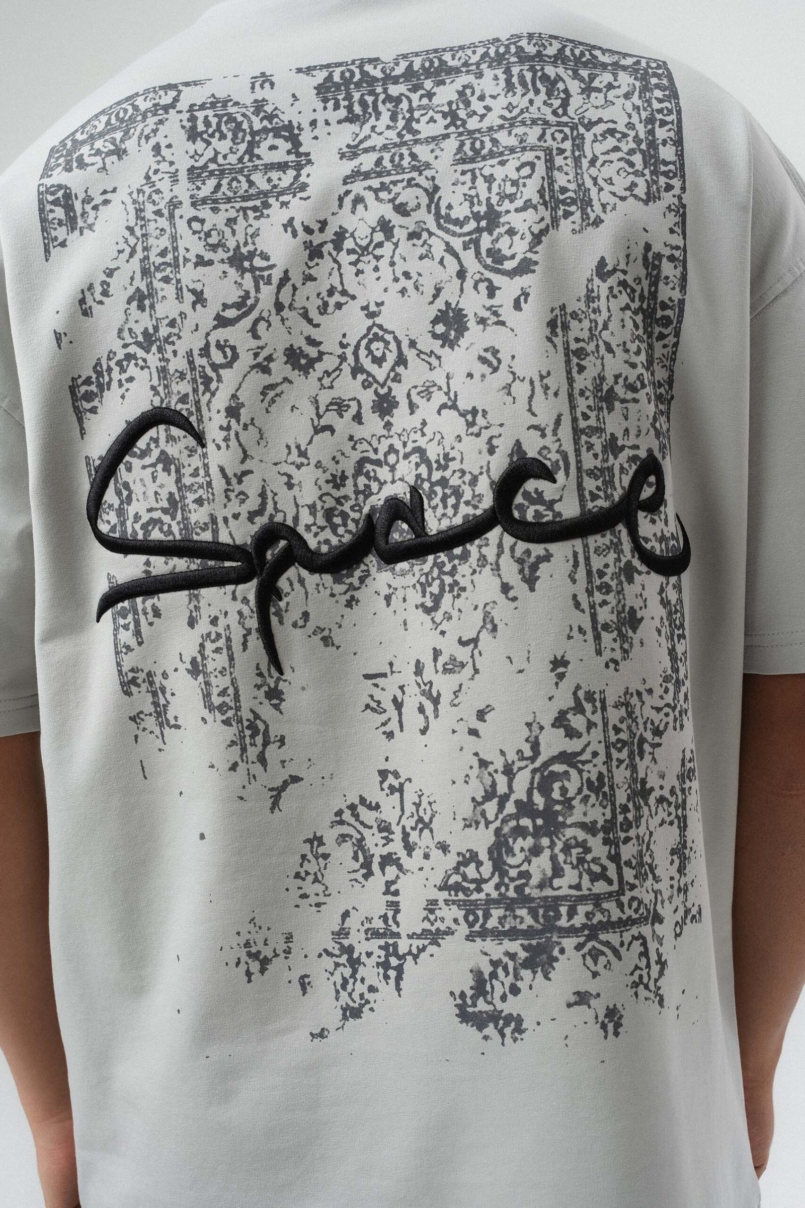 Space Etnik Desen Embroidered Gray Oversize Printed T-Shirt
