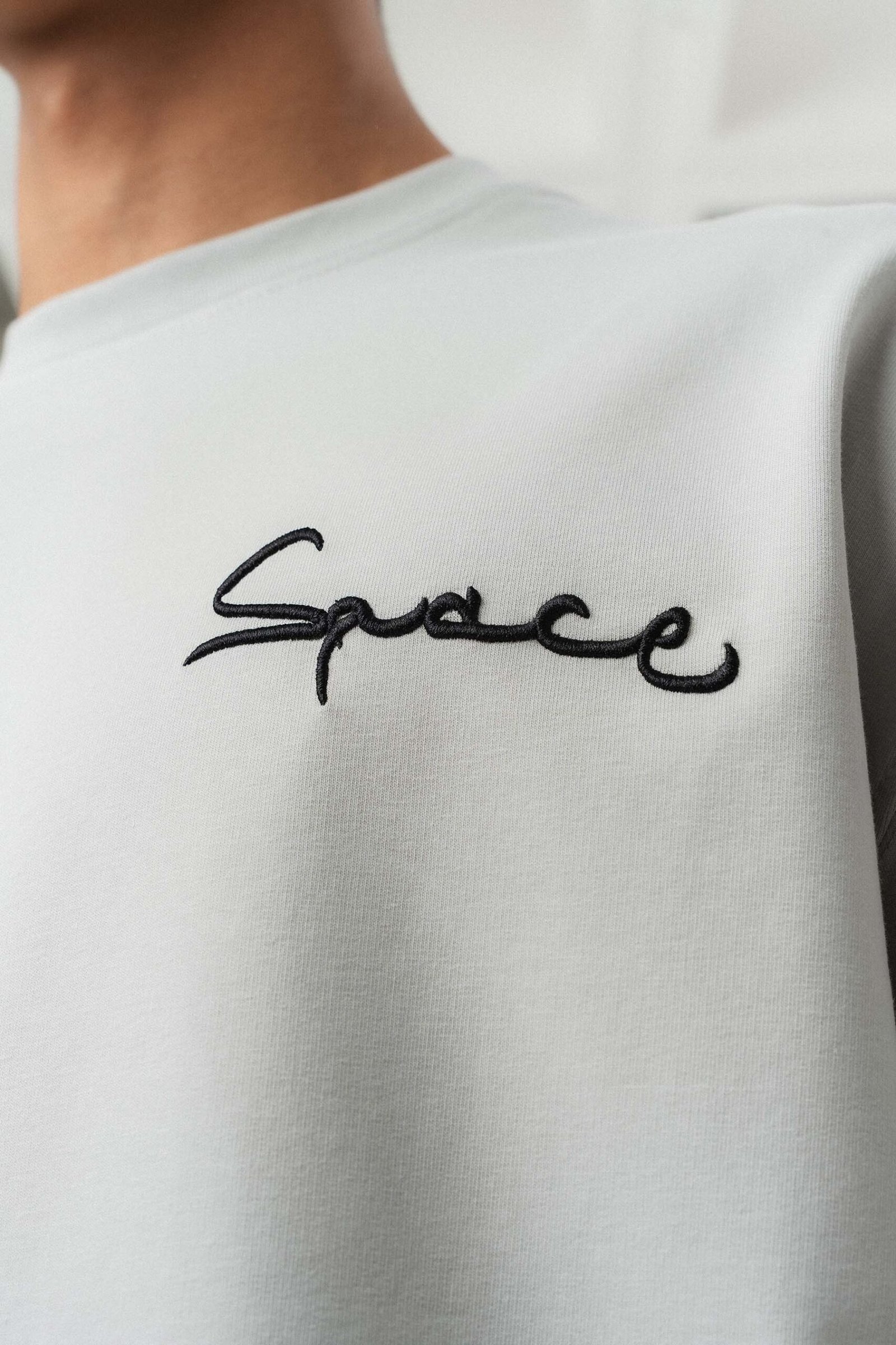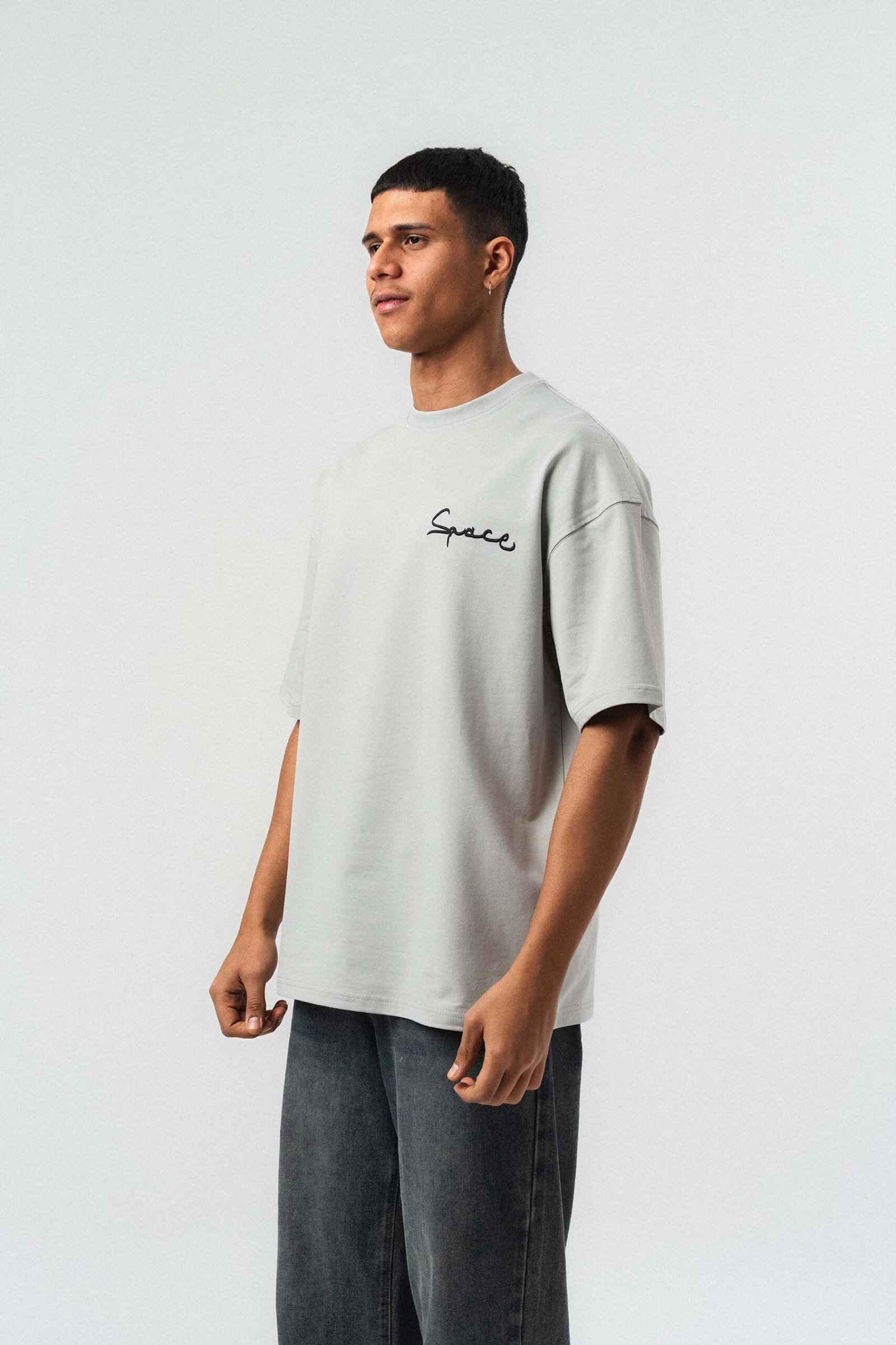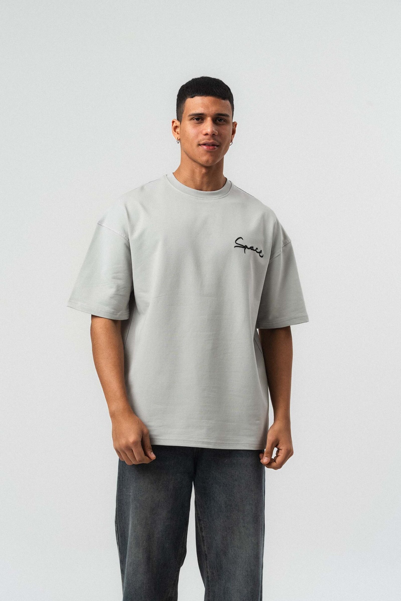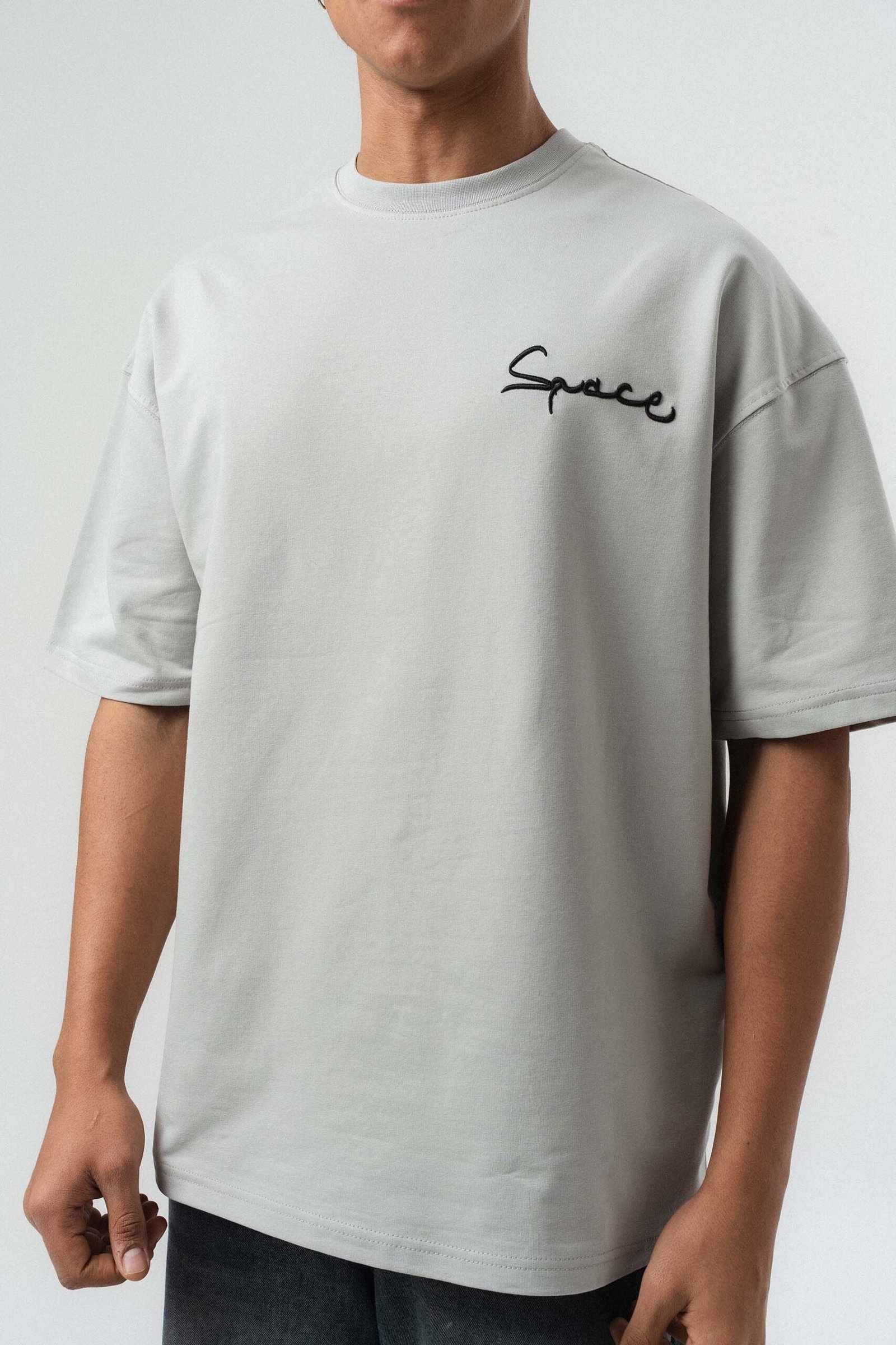 Space Etnik Desen Embroidered Gray Oversize Printed T-Shirt